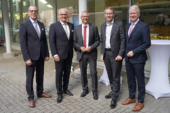 Handwerk und Politik verabschieden HWK-Hauptgeschäftsführer Andreas Katschke (v.l.n.r.): Christian Maack (stellvertretender Hauptgeschäftsführer der Handwerkskammer Lübeck), Kammer-Präsident Ralf Stamer, Kammer-Hauptgeschäftsführer Andreas Katschke, Ministerpräsident Daniel Günther sowie Holger Schwannecke, Generalsekretär des Zentralverbandes des Deutschen Handwerks (ZDH)
